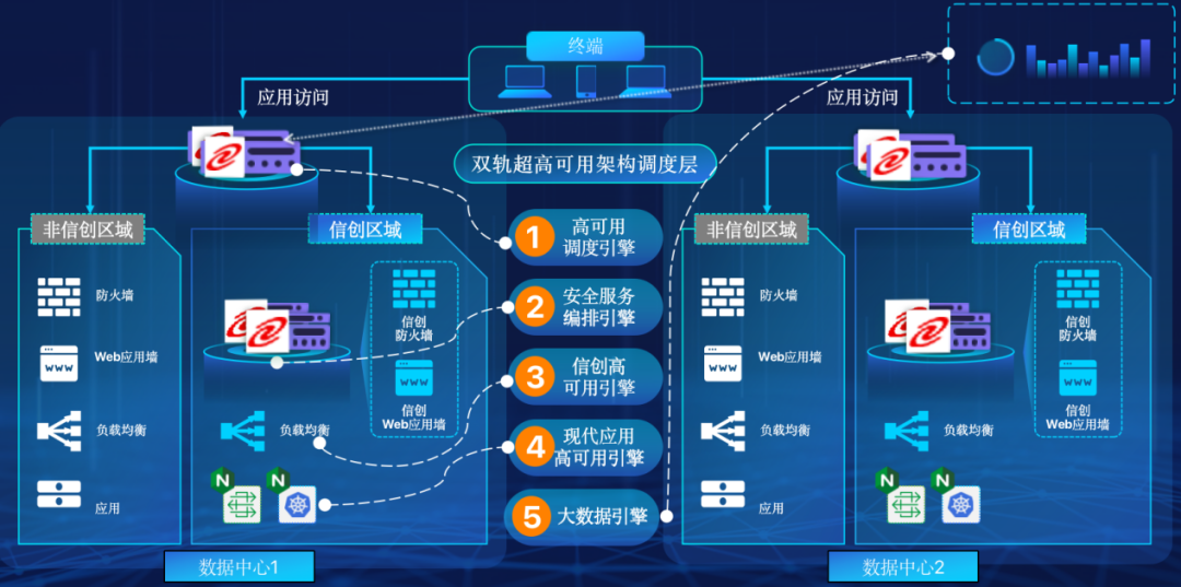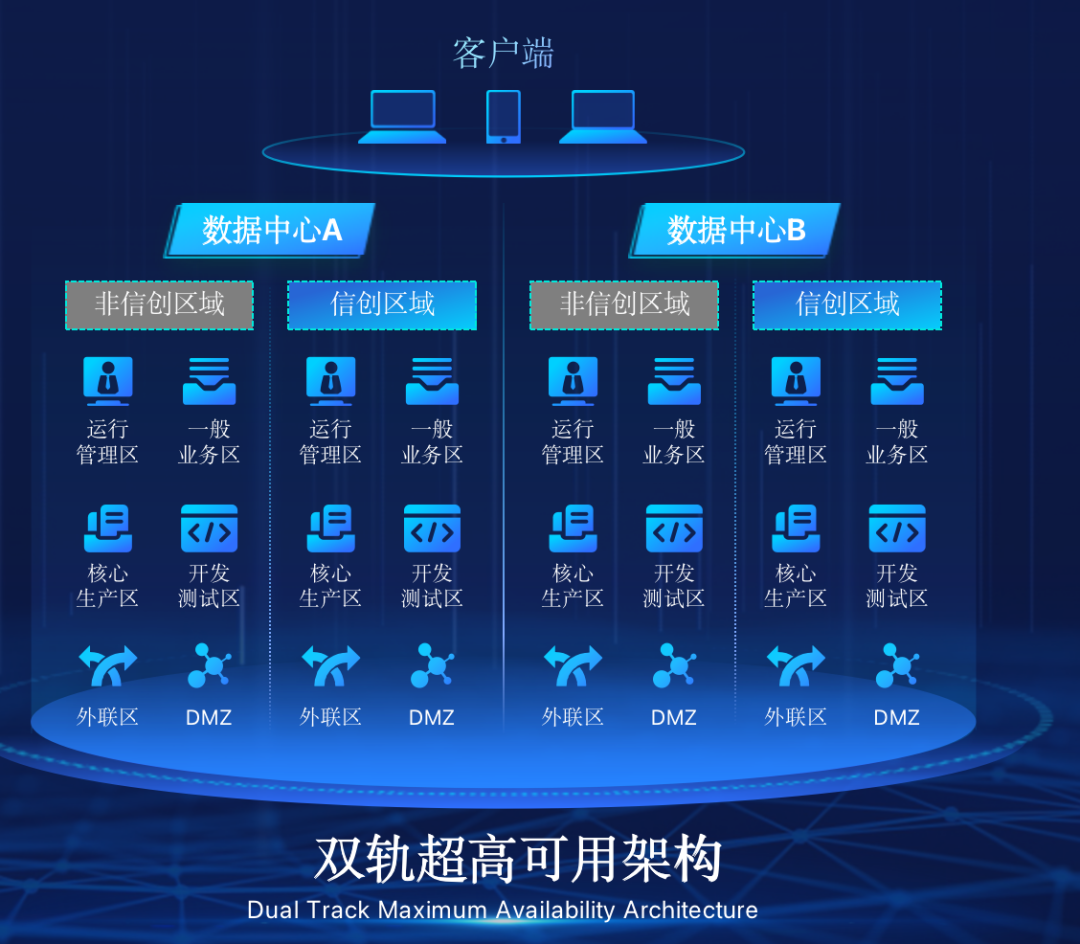 非凡娱乐在企业面临自主创新IT基础重构过程中,推出的全新架构双轨超高可用架构(简称DTMAA),在双活数据中心的分区调度基础上,添加每个数据中心内信创域和非信创域的分域调度,来实现分区分域协同的多活双轨超高可用。