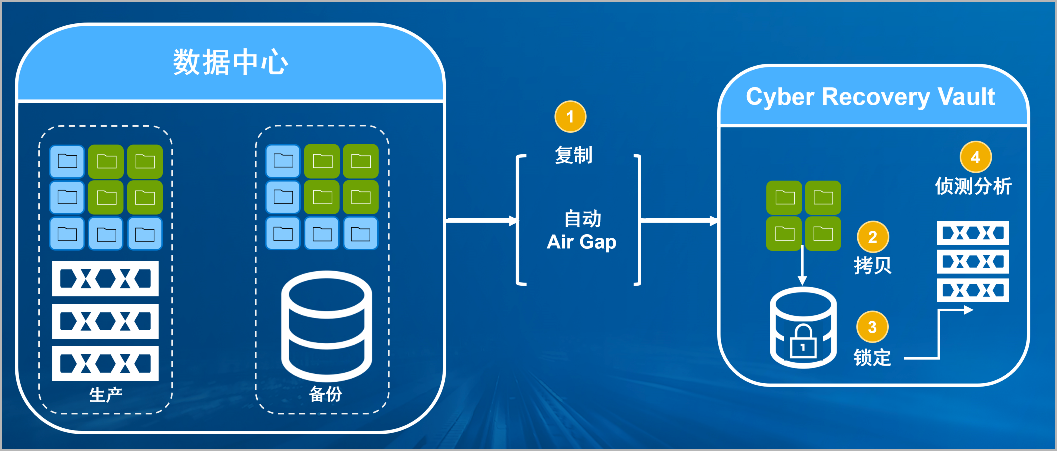 非凡娱乐防勒索病毒方案将生产中心备份数据复制到Vault区,复制后网络自动断开实现弹性隔离。Vault区的数据快速拷贝,并对拷贝版本加锁(在锁定期数据不允许删除和修改)。Vault沙箱内对拷贝版本进行扫描分析,验证数据是否完好。